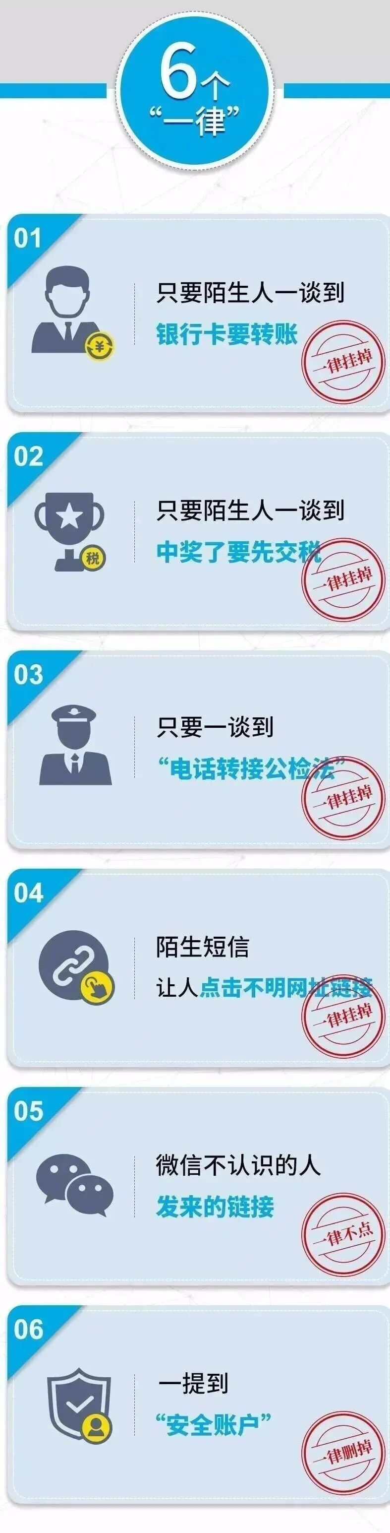 对于任何人,尤其是陌生人,不可随意轻信和盲目随从,遇人遇事,应有清醒的认识,不要因为对方说了什么好话,许诺了什么好处就轻信、盲从。要懂得调查和思考,在此基础上作出正确的反应。接到类似要钱、转账的信息及电话务必要提高警惕、有防诈意识,切记“不听、不信、不汇款”,一定要及时与学校、孩子直接联系、亲自核实。对诈骗分子的各种理由、诈骗手段要谨言慎行。