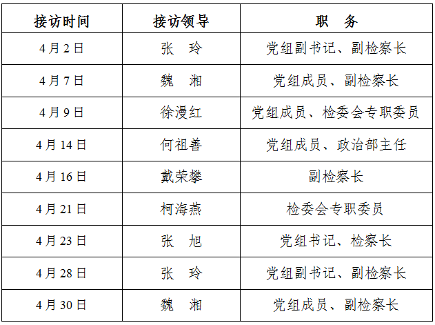 为认真贯彻习近平法治思想,践行新时代检察机关以人民为中心的发展理念,确保人民群众诉求表达途径畅通,切实做细做实群众信访工作,提升12309检察服务中心服务质效,现将本院“检察长接访日”2026年4月接访安排公告如下: